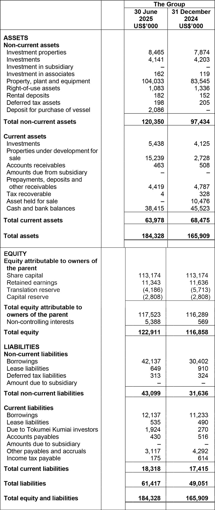 - Properties under development for sale rose to US$15.2 million (31 Dec 2024: US$2.7 million) due to new projects and add-on capital injections to existing investments.